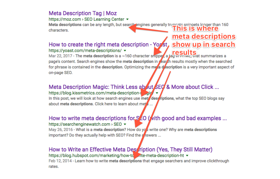 Meta descriptions are short blurbs that serve as a preview, or “description,” of the content of a page. They’re mainly found in search results.