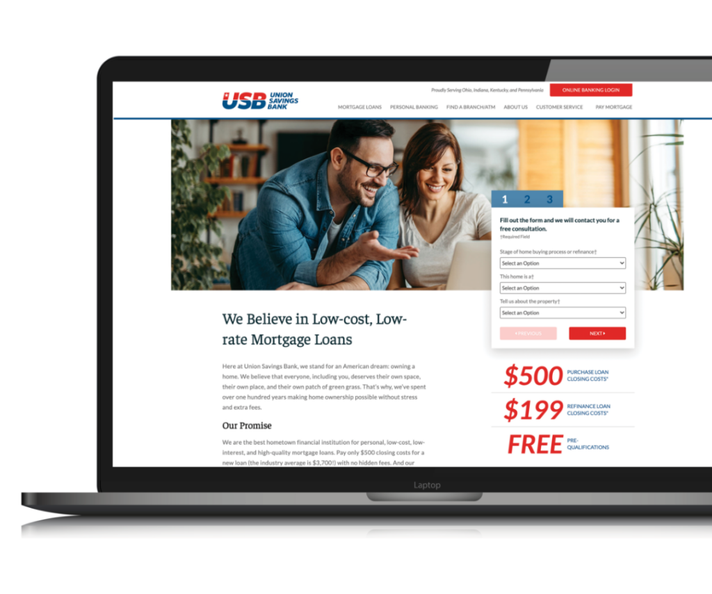 Union Savings Bank, a regional bank serving Ohio, Indiana, Kentucky, and Pennsylvania, was seeking to improve the performance of their paid search campaigns to increase mortgage leads. There were over 1,800 ad groups in Google Ads alone when we took over. This makes management difficult, so we started by simplifying the account structure, trimming 1,800 ad groups down to 16 with no drop in performance.